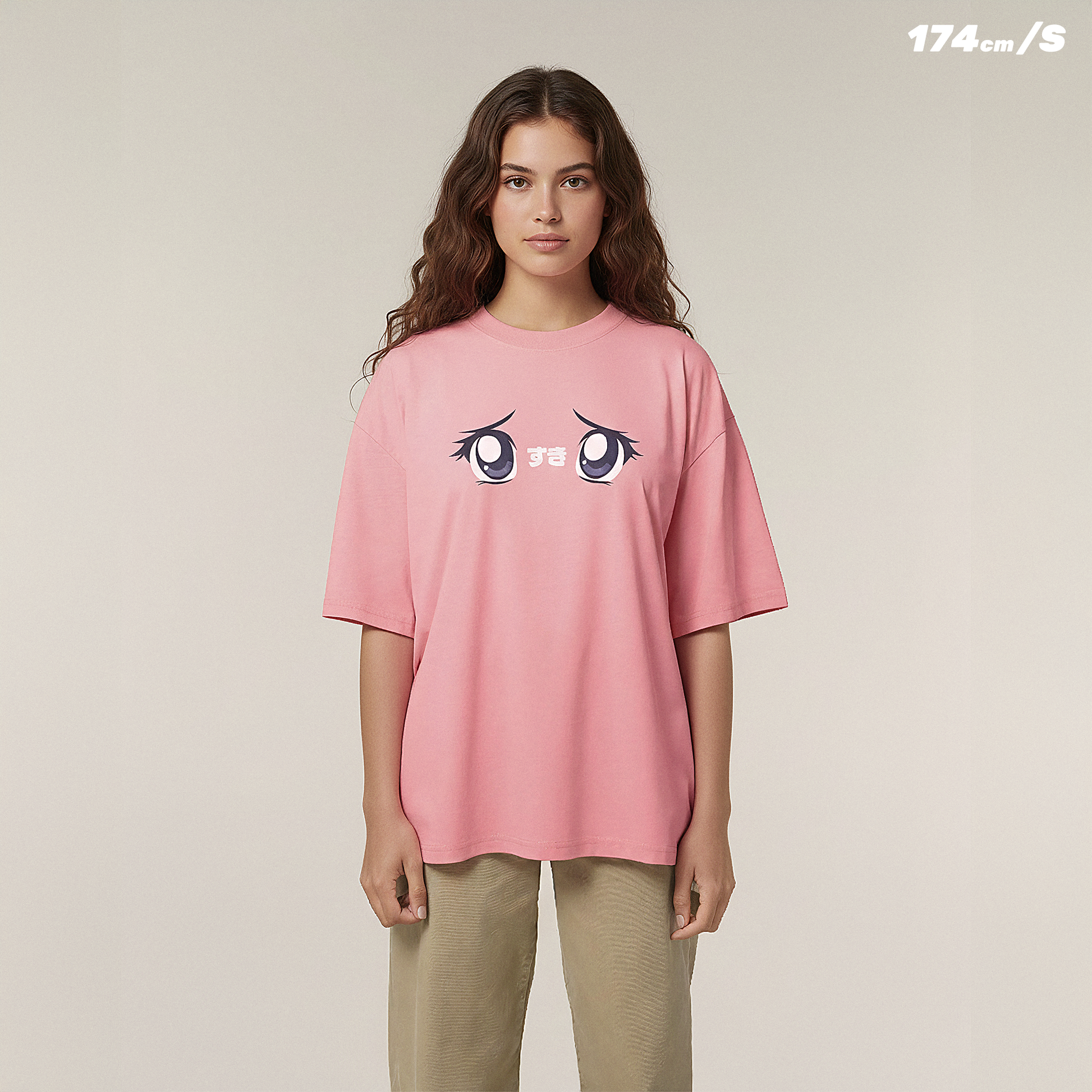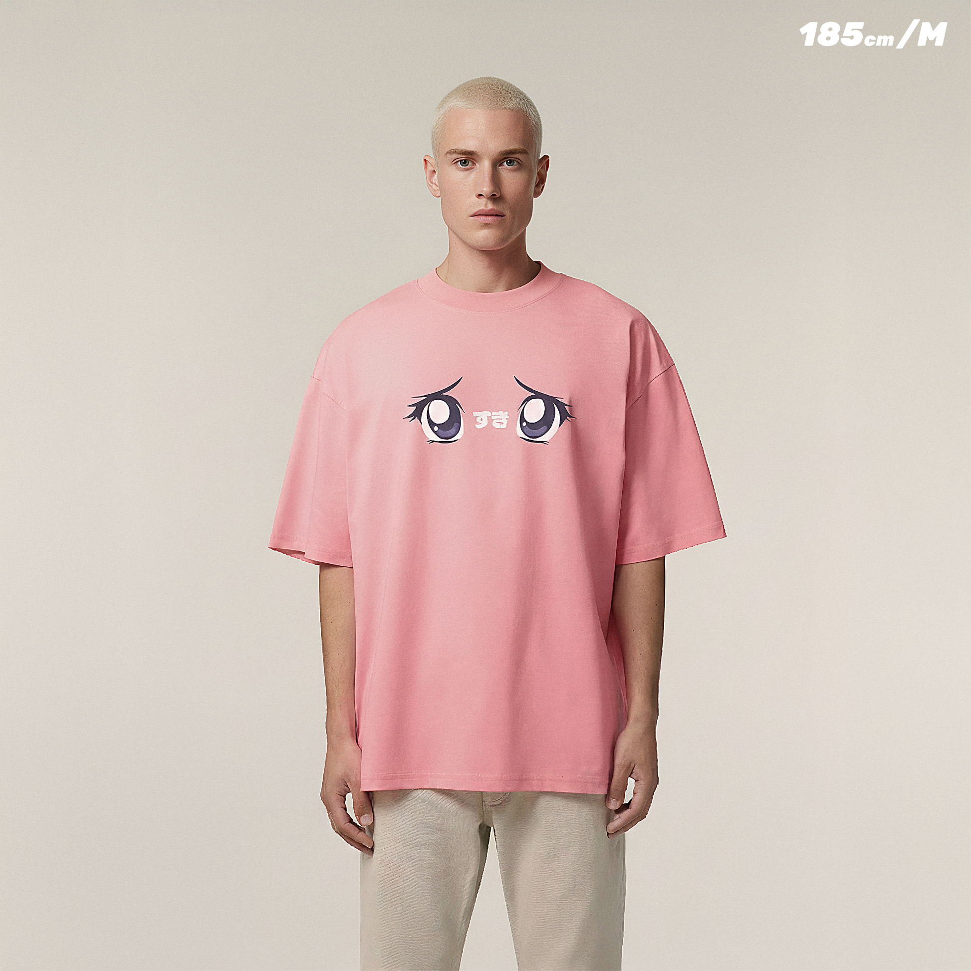 Bright bubblegum pink. Anime eyes and a love message: き means I like you